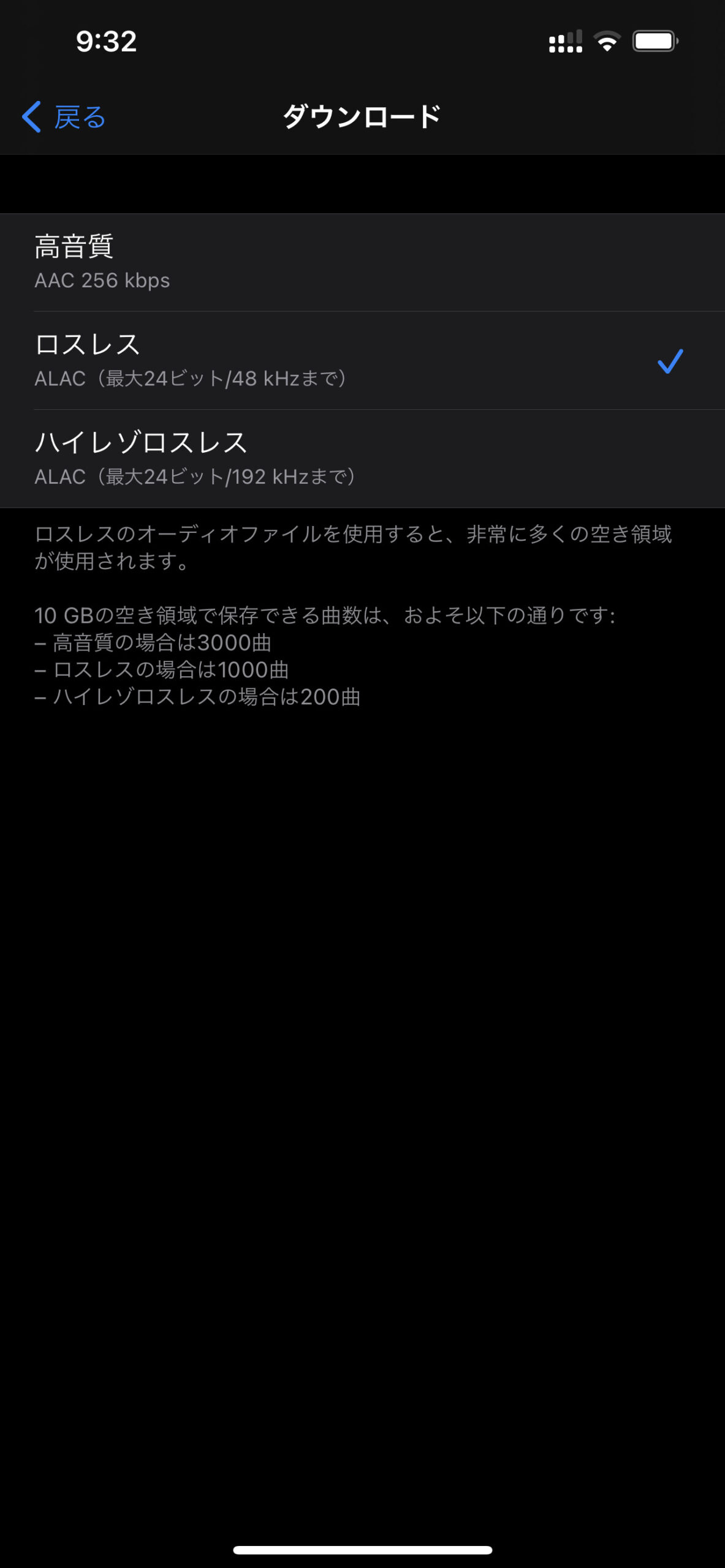 これはWi-Fi環境に接続されている時、データ量の大きいロスレスをストリーミングで視聴できる設定です。自宅で光回線などを利用されている方ならロスレスに設定してもいいかもしれません。