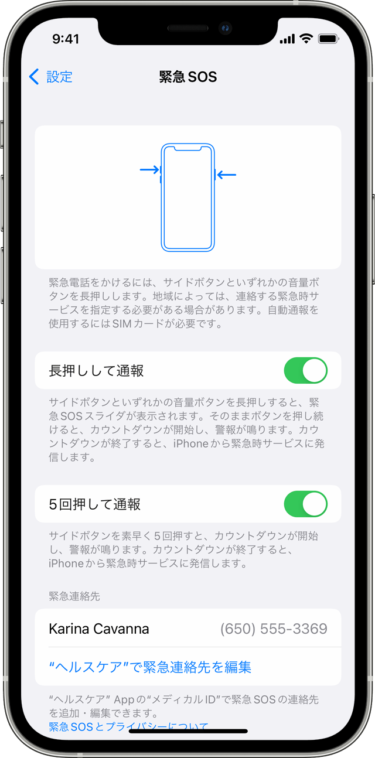 ここで緊急SOSのスライドバーを操作すれば、すぐに通報することができますが、身動きが取れないような状況下でも通報できるように、設定にある「5回押して通報」も有効にしておくことをお勧めします。