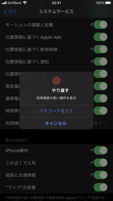 システムサービスの一覧にある「利用頻度の高い場所」をタップすると、Touch IDまたはFace IDによる認証を求められます。