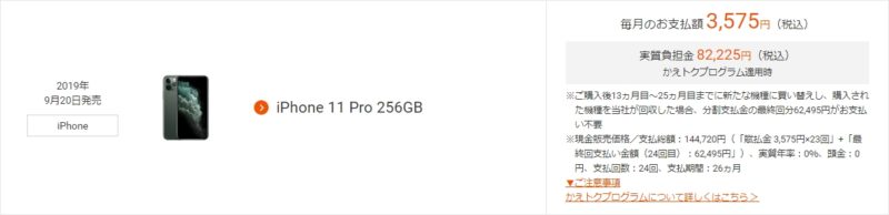 実際にauのページで確認してみましたが、次のようなiPhone11 Proの256GBなら下のような負担で購入することが出来ます。