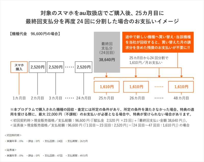 24回目の支払い時に、機種変更も継続利用もしないという選択が選べるようになりました。この場合、auにスマートフォンを返却すると本体状況や所定の条件を満たした場合、買い取ってくれます。