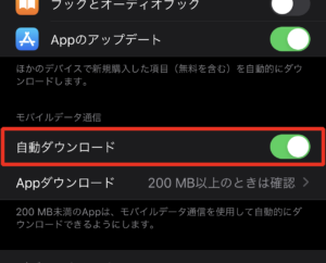 3. モバイルデータ通信をタップし「自動ダウンロード」をオフ(白)にします。