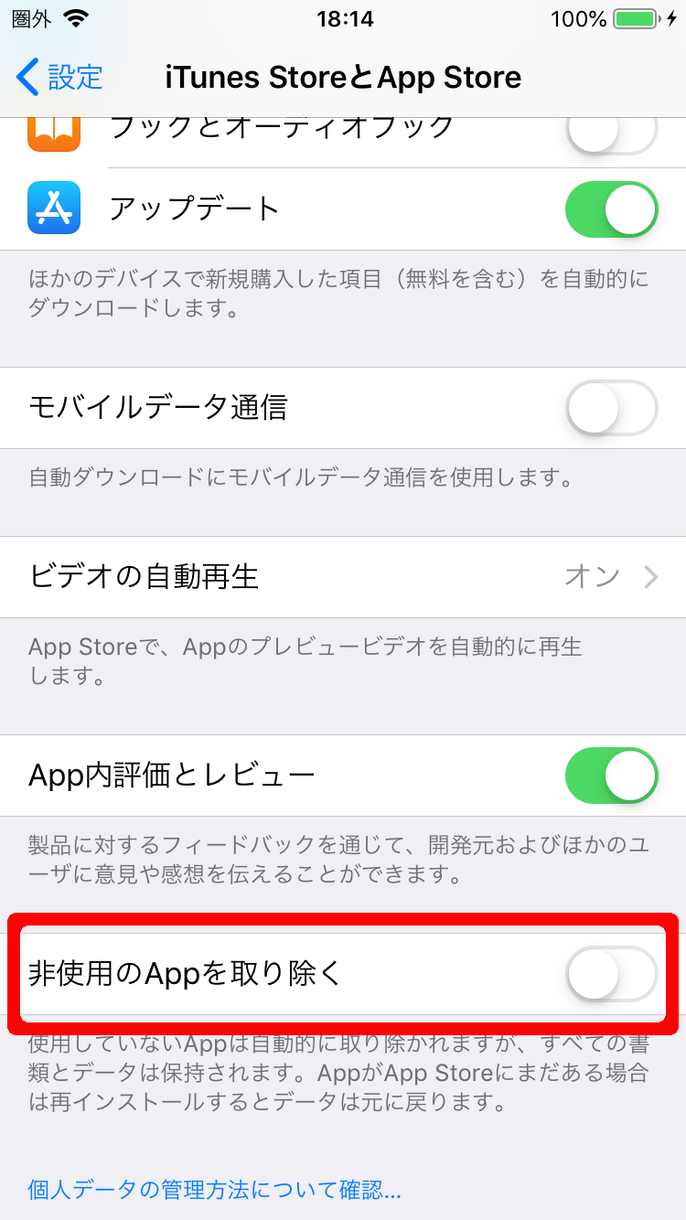 iOS13以降のiPhoneを利用されている方は、「設定」>「iTunes StoreとApp Store」のなかに「非使用のAppを取り除く」があるので、スイッチをタップしてオン(緑色)にしましょう。