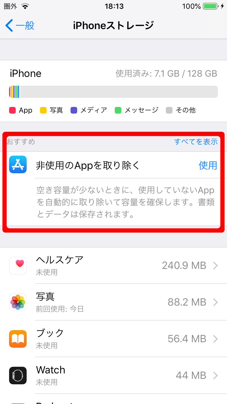 4. おすすめ欄に「非使用のAppを取り除く」という項目が表示されるので、「使用」の文字をタップして設定を有効にします。