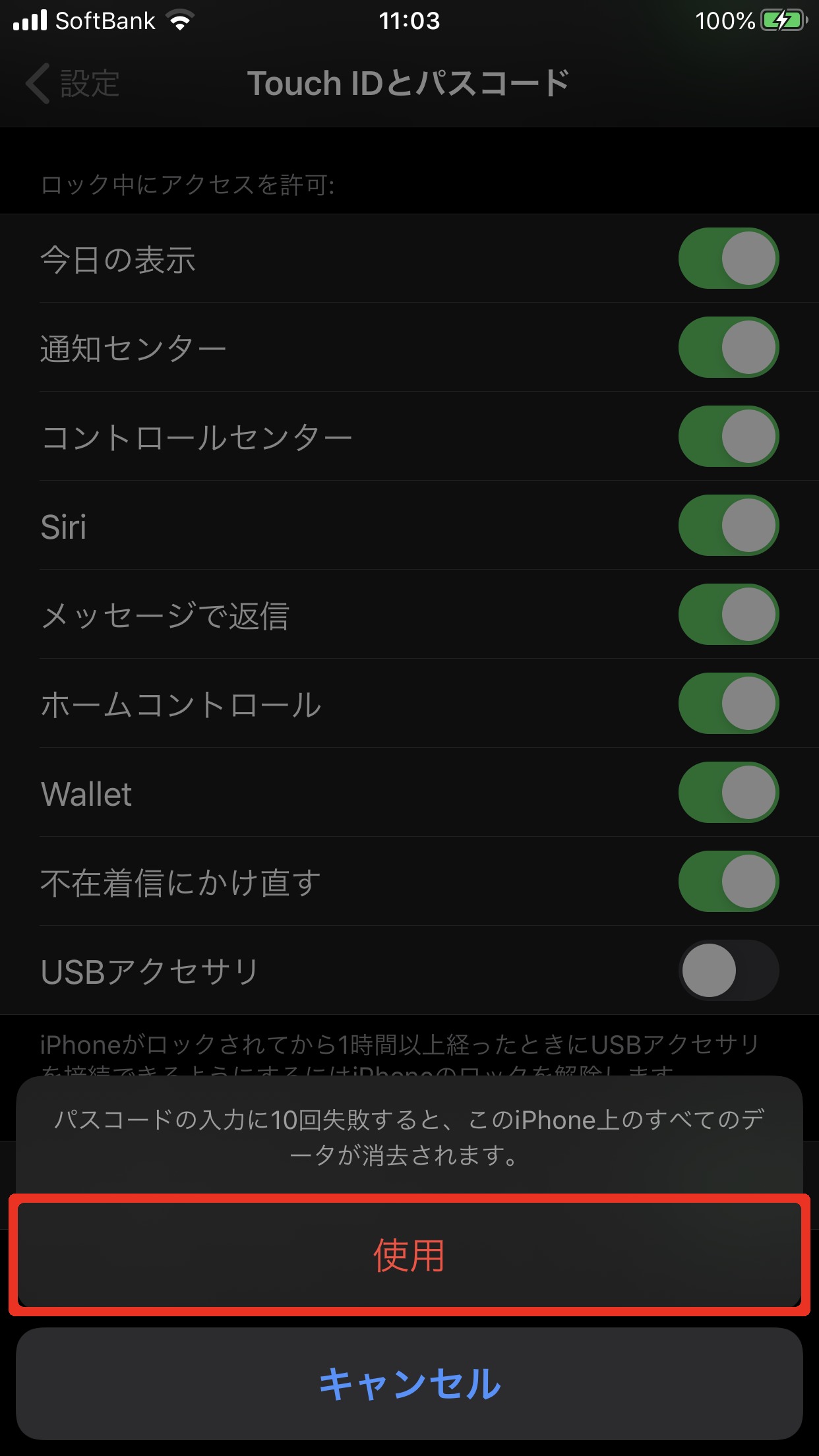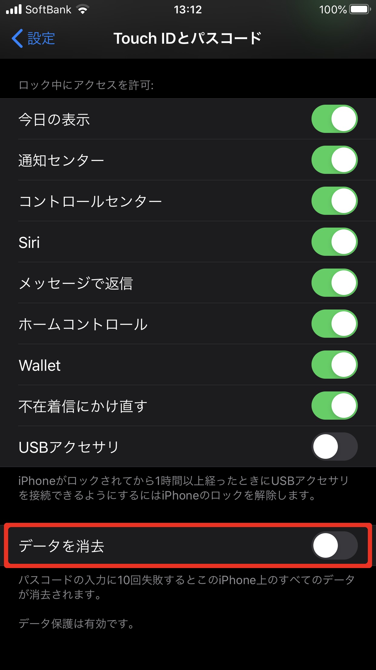 こうした攻撃に対して有効なのがパスワードアタックになります。10回間違えたパスコードを入力すると、データを消去してくれる機能になります。iPhoneの所有者であれば、10回も連続で間違えるなんてなかなかありませんよね。悪質な犯罪からiPhoneのなかのデータを守るために使える便利機能ですのでオンに設定しておくのをおすすめします。