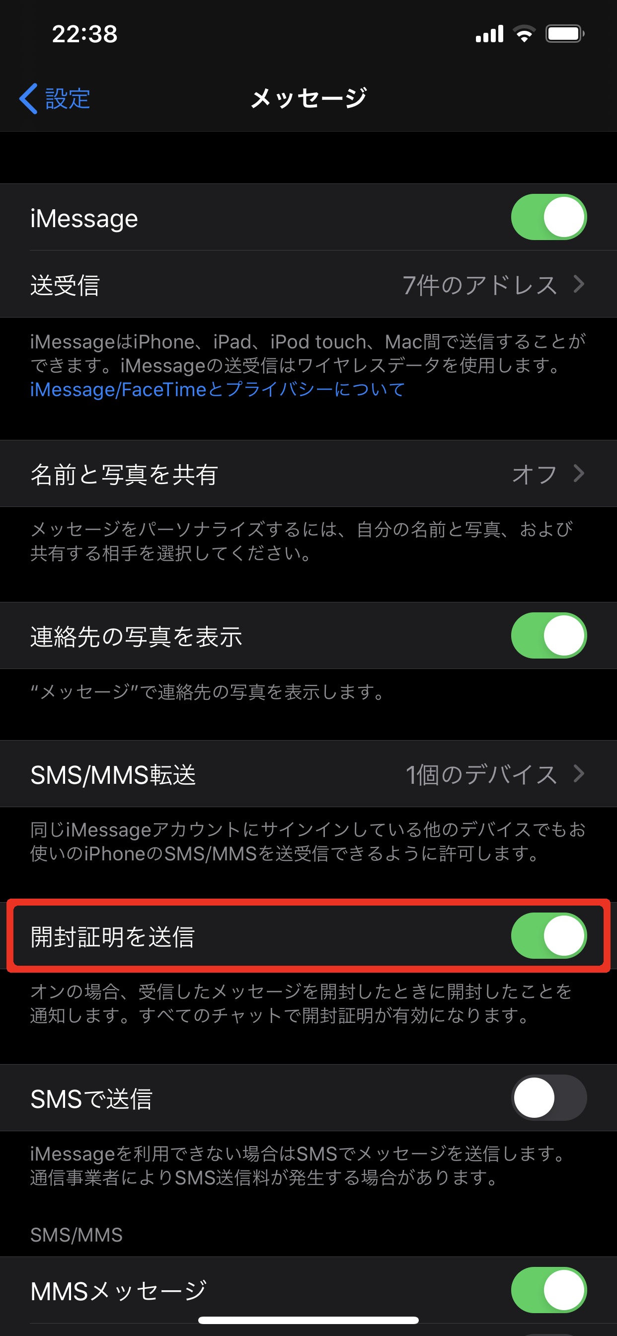 iPhoneの開封証明とは、オンにすると受信したメッセージを開封したときに通知してくれるサービスになります。ここの設定をオンにするとすべてのチャットが対象になるので開封証明が使えるようになります。意外と知らない設定になりますので、困っている方は開封証明を設定してみてもいいと思います。