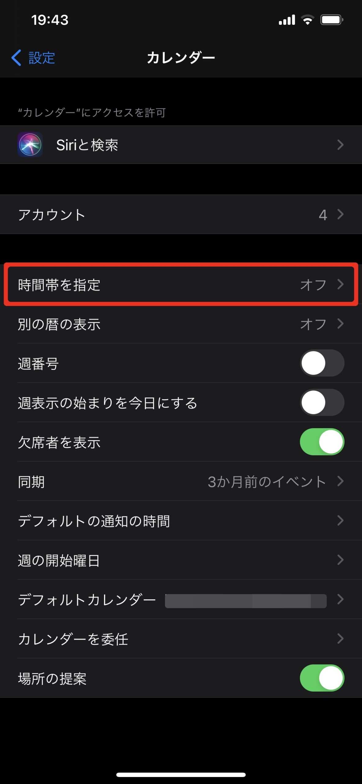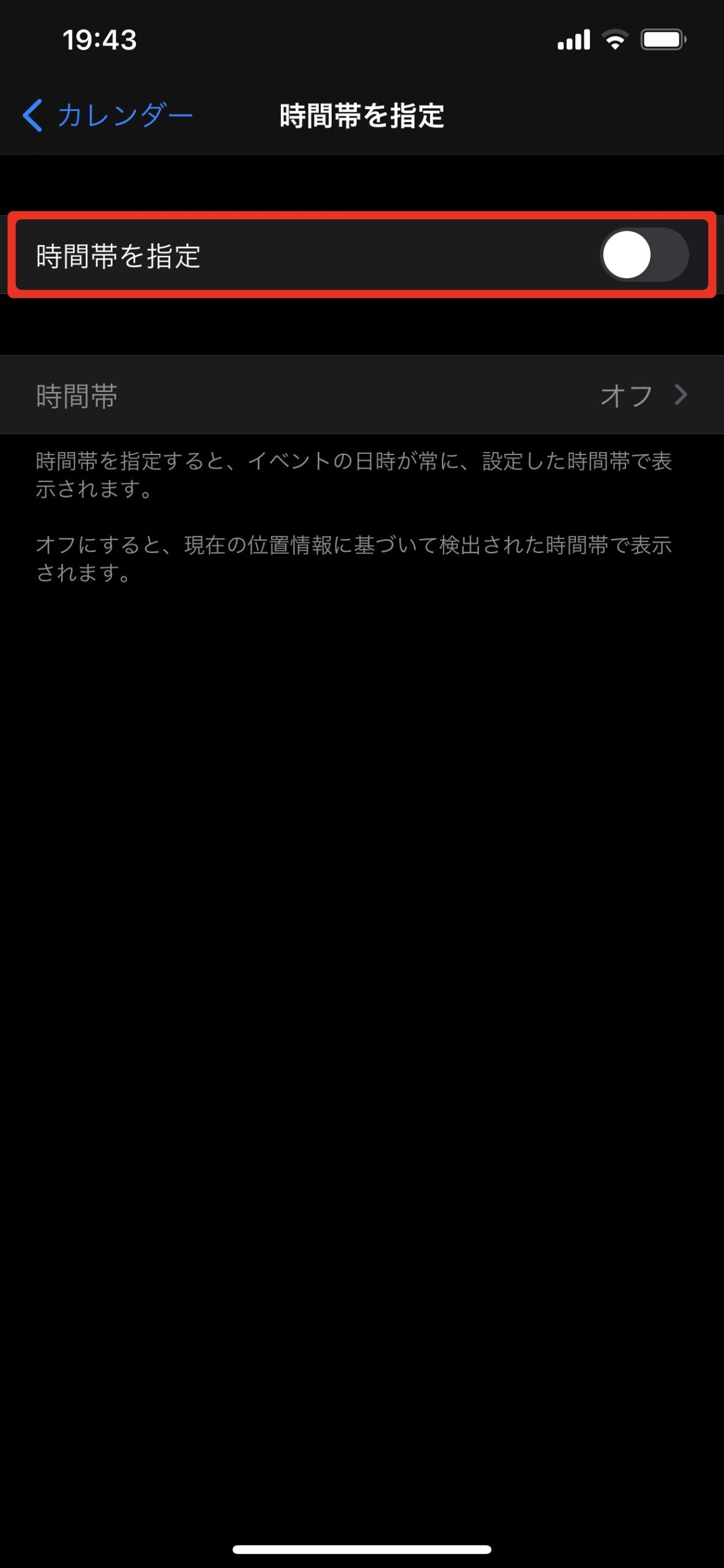 ここでオフに設定していると、今の位置情報に基づいて検出された時間帯を表示してくれます。頻繁に同じ時間帯でイベントを入力するときにも、とても便利な方法になります。カレンダーを手帳代わりに使っている人もいますし、iPhoneなら毎日持ち歩いていますよね。ちょっとしたイベントの入力のときに一から入れるのはとても大変なことです。