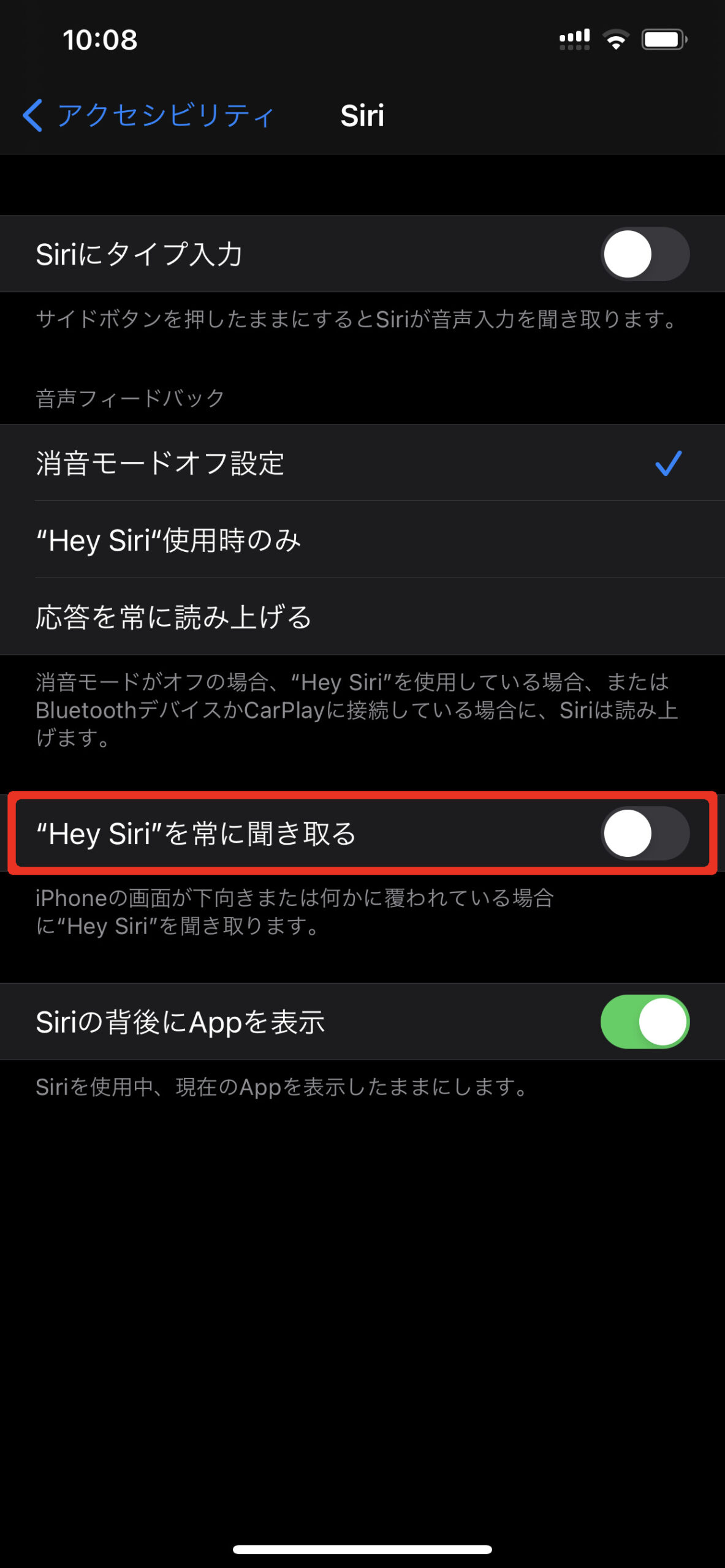 4. 画面の下部にある「HeySiriを常に聞き取る」をオン(緑)に変更します