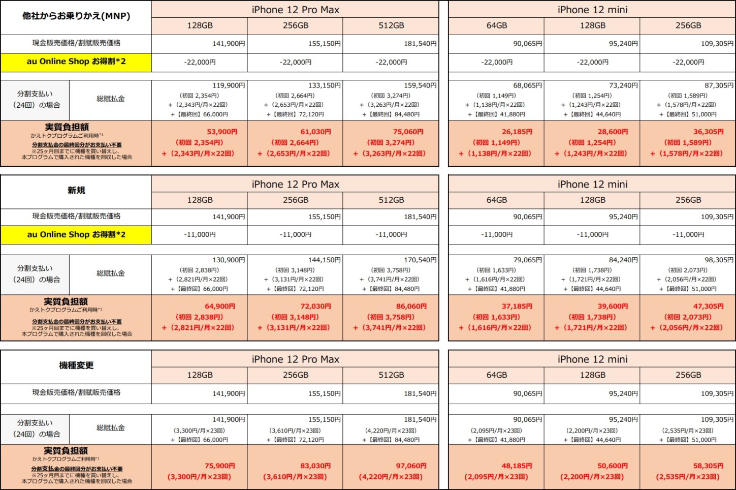 出典:KDDI iPhone12 mini、iPhone12 Pro Max価格表