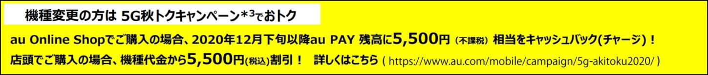 割引の詳細はau online shop割で、新規、MNP(乗り換え)で割引額が変わります。新規とは11,000円、MNPは22,000円、機種変更はau online shopでも店頭の場合でもau PAYへ5,500円のキャッシュバックのキャンペーンを実施中です。